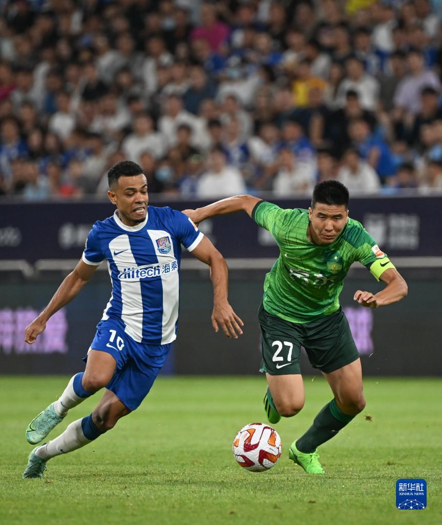 8月9日,天津津门虎队球员法利·维埃拉·罗萨(左)与北京国安队球员王刚在比赛中拼抢。新华社记者 孙凡越 摄