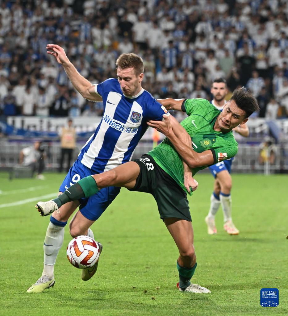 8月9日,天津津门虎队球员罗伯特·贝里奇与北京国安队球员张呈栋(右)在比赛中拼抢。新华社记者 孙凡越 摄