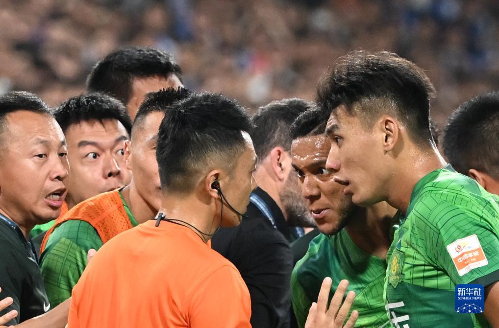 8月9日,北京国安队球员德索萨(右二)和张呈栋(右前)与边裁争论。新华社记者 孙凡越 摄