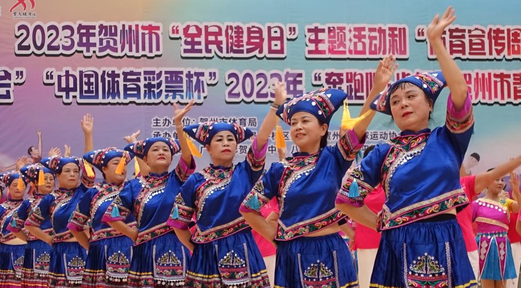 ↑8月8日,广西贺州市群众表演民族健身舞。