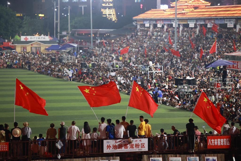 ↑这是7月29日拍摄的贵州榕江(三宝侗寨)和美乡村足球超级联赛年度总决赛现场。