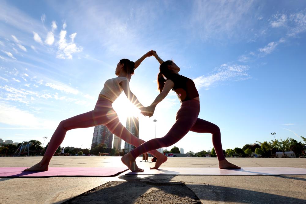 ↑8月8日,市民在山东省枣庄市东湖公园练瑜伽。