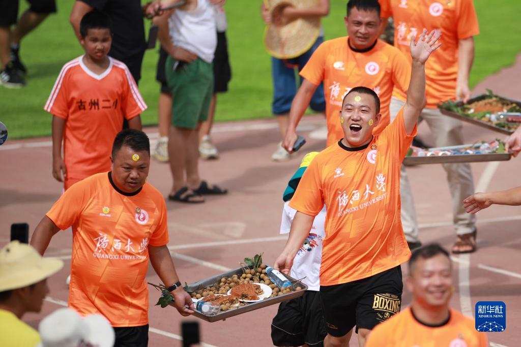 8月13日,广西大学甘蔗汁队球员在入场时展示当地美食。新华社记者 刘续 摄