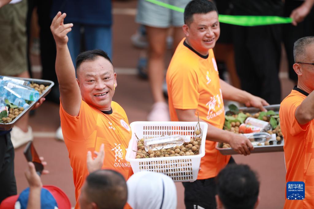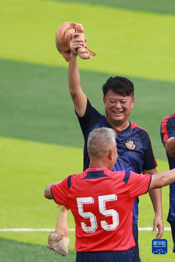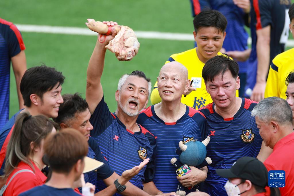 8月13日,香港明星队球员陈百祥举起作为比赛奖品的猪蹄。最终香港明星队以4比3战胜榕江村民队。新华社记者 刘续 摄