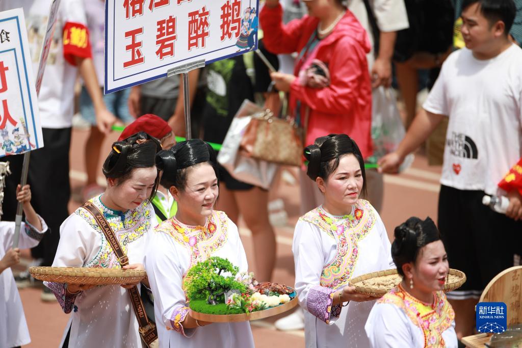 8月13日,工作人员进场时展示当地美食。新华社记者 刘续 摄
