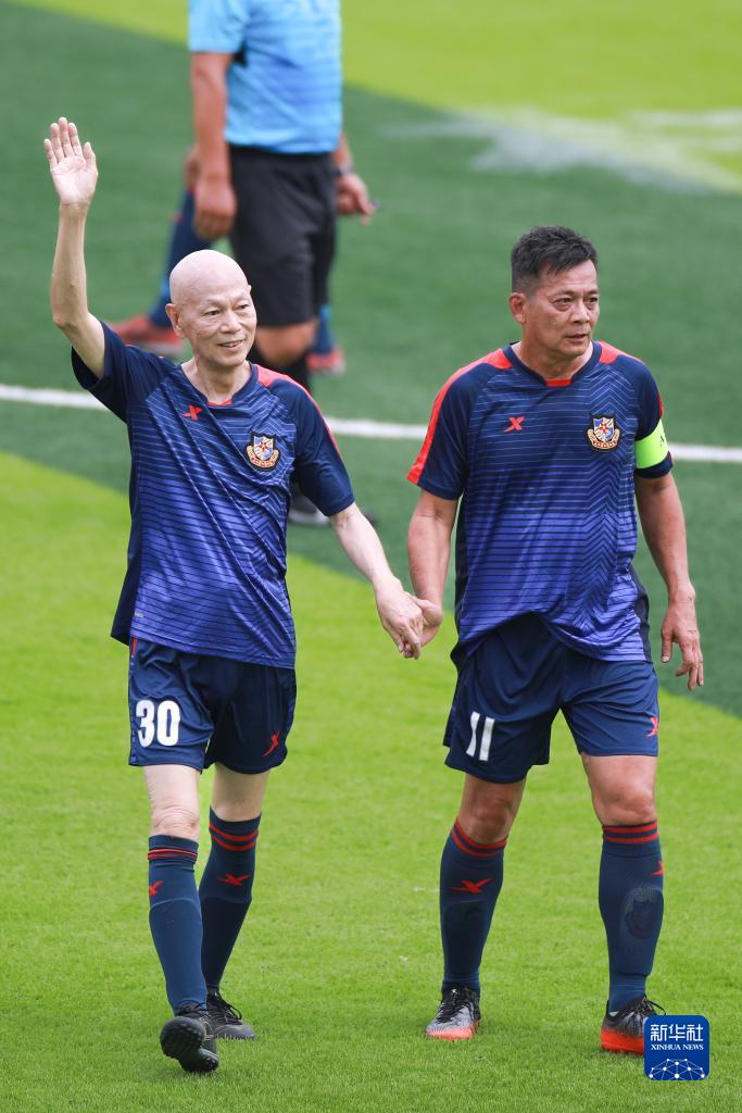 8月13日,香港明星队球员罗家英(左)、黄日华向球迷致意。最终香港明星队以4比3战胜榕江村民队。新华社记者 刘续 摄