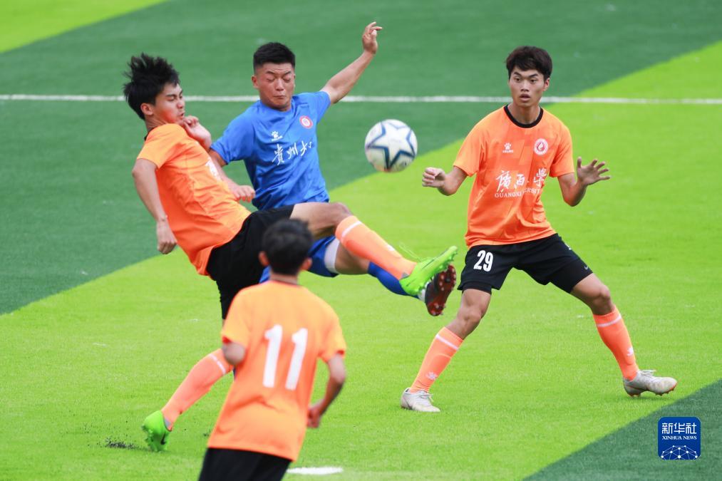 8月13日,贵州大学生态茶队球员与广西大学甘蔗汁队球员在比赛中拼抢。新华社记者 刘续 摄