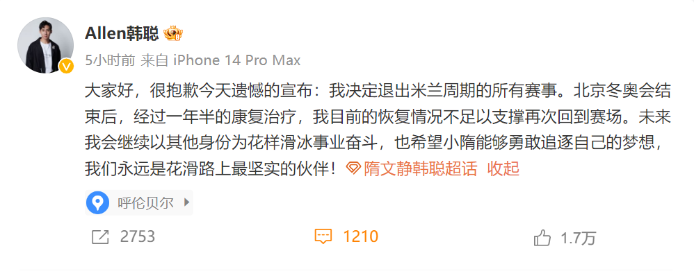 “大家好,很抱歉今天遗憾地宣布:我决定退出米兰周期的所有赛事。北京冬奥会结束后,经过一年半的康复治疗,我目前的恢复情况不足以支撑再次回到赛场。未来我会继续以其他身份为花样滑冰事业奋斗,也希望小隋能够勇敢追逐自己的梦想,我们永远是花滑路上最坚实的伙伴!”韩聪写道。