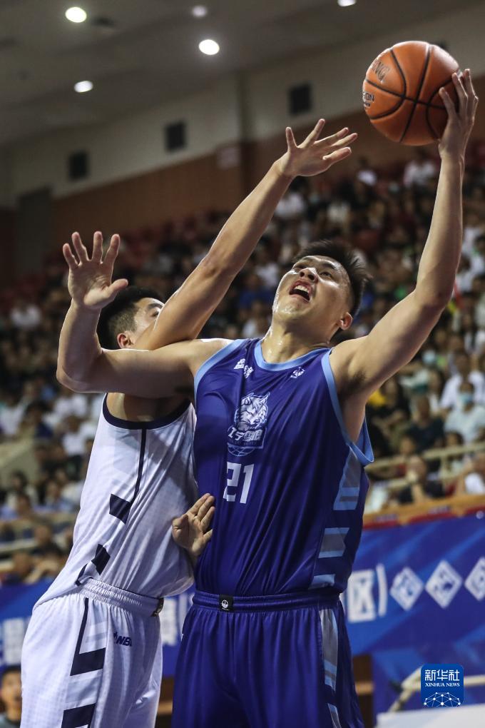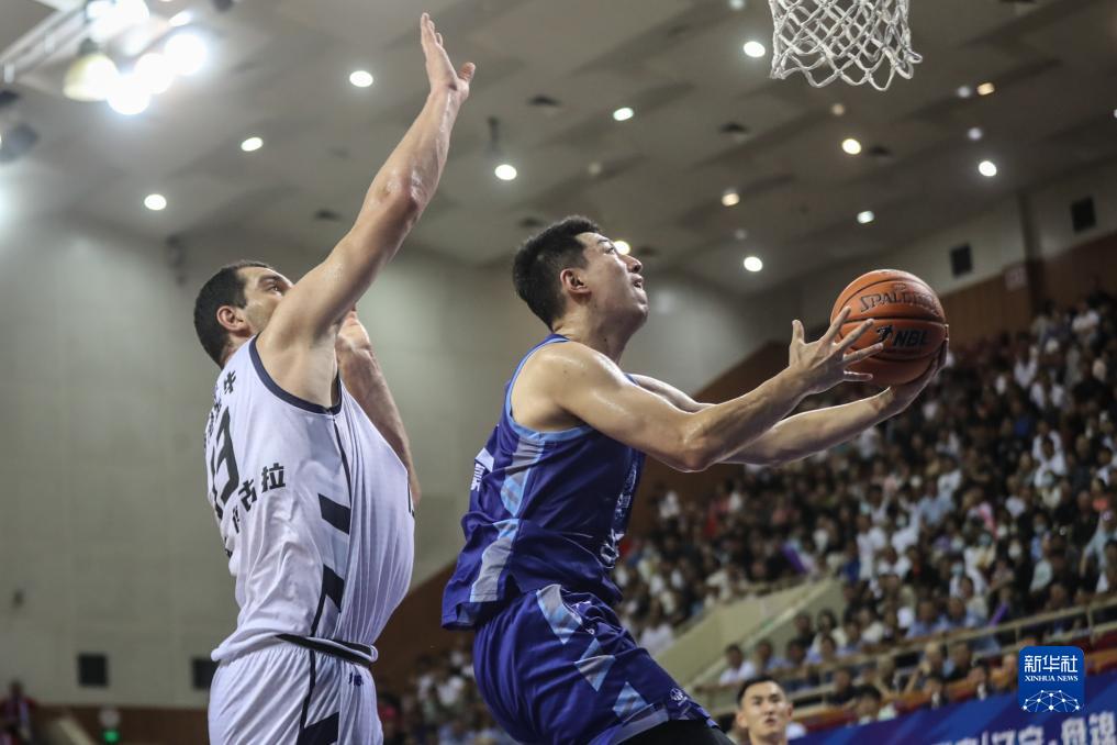 8月16日,辽宁益胜队球员刘子豪(右)在比赛中上篮。新华社记者 潘昱龙 摄