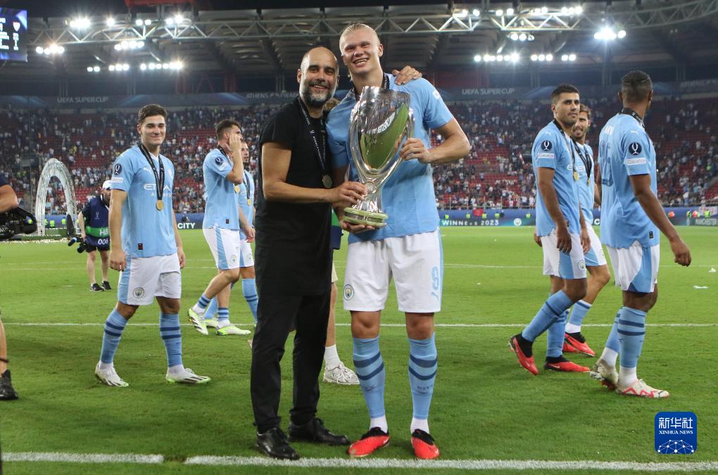 8月16日,曼城队主教练瓜迪奥拉(左)与哈兰德在比赛后与奖杯合影。新华社发(帕纳约蒂斯·莫斯卡德里欧摄)