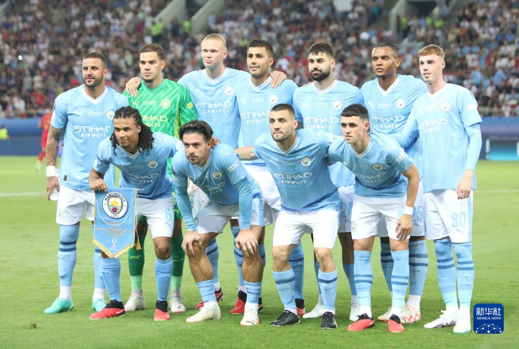 8月16日,曼城队首发球员在比赛前合影。新华社发(帕纳约蒂斯·莫斯卡德里欧摄)
