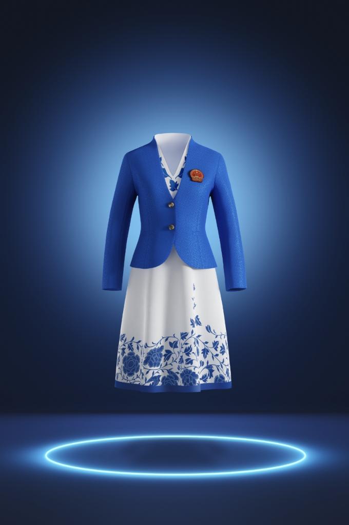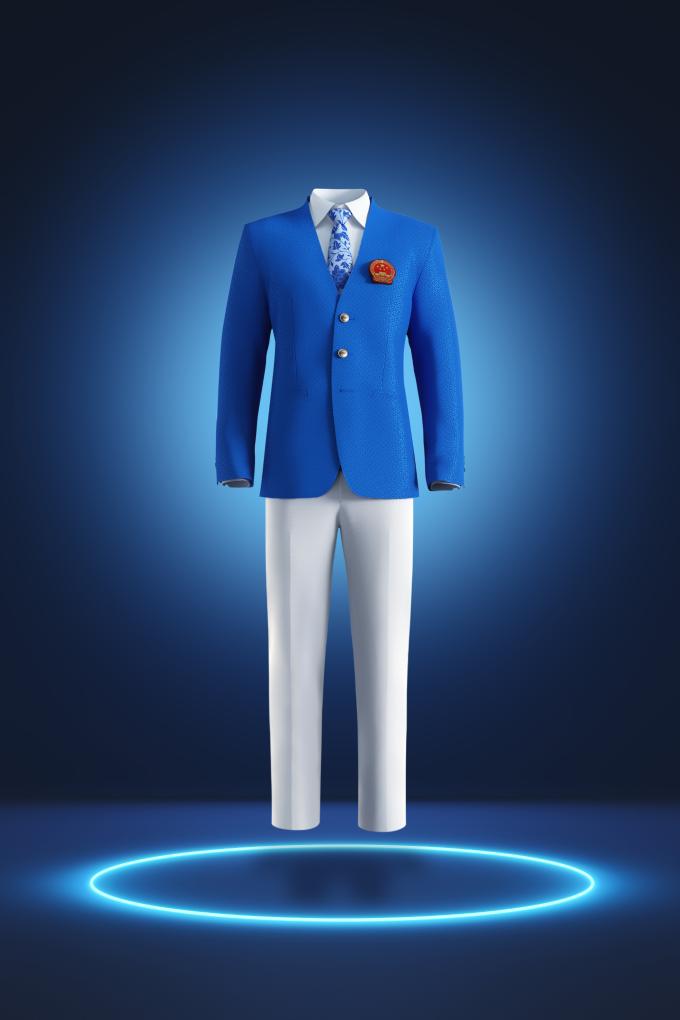 “按照惯例,此次礼服样式与以往设计样式‘一脉相承’。”贺阳介绍,男装为“V”型领西装,领子的肩颈处抬高,有中式立领的意味;女装为合体上衣,“V”型领上衣内搭牡丹纹样的“A”型裙子。另外,此次外衣面料采用锁甲纹提花织造,使上衣更具质感,锁甲环环相扣,象征出征的战士们,具有坚不可破的寓意。