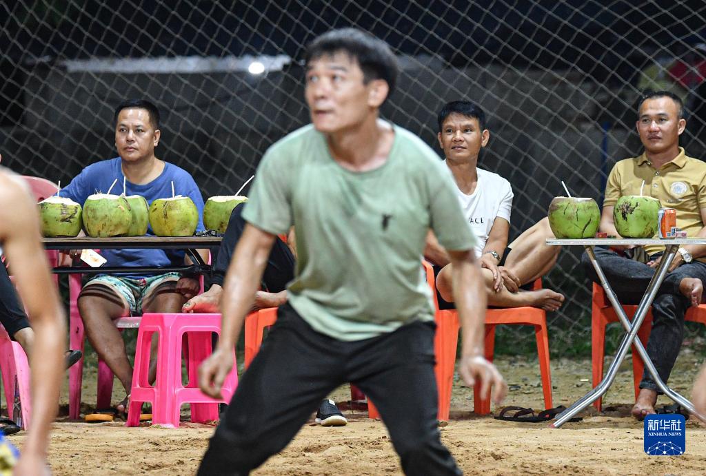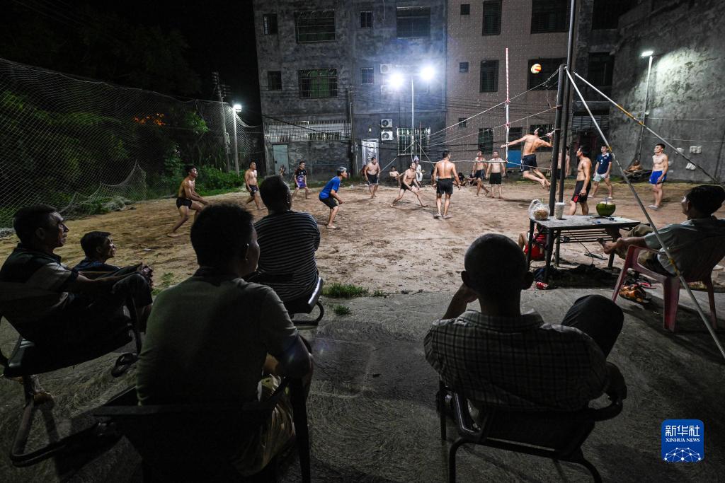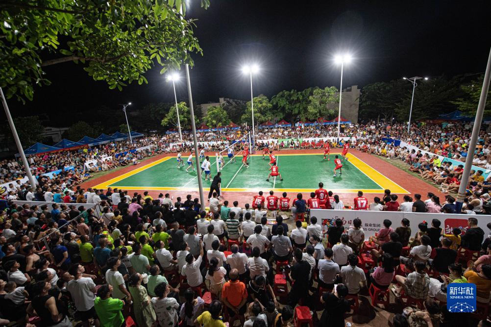 人们在海南省文昌市东阁镇一个小型沙地球场观看排球比赛。该球场由当地群众自费修建,人们常在此打球至深夜(7月18日摄)。新华社记者 蒲晓旭 摄