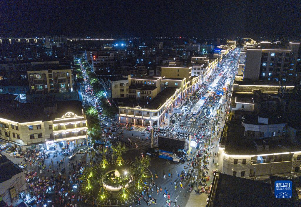 “村排”铺前站赛后,随着大批观众离场,海南省文昌市铺前镇各条街道人头攒动(无人机照片,7月23日摄)。新华社记者 蒲晓旭 摄