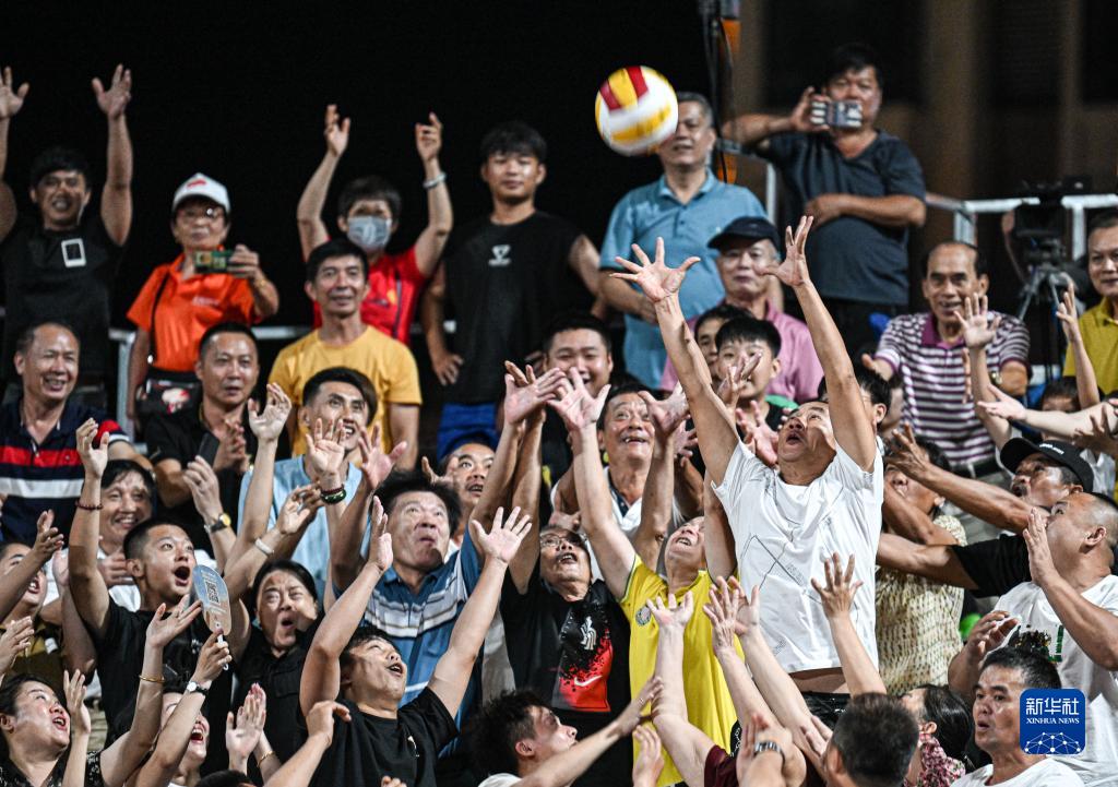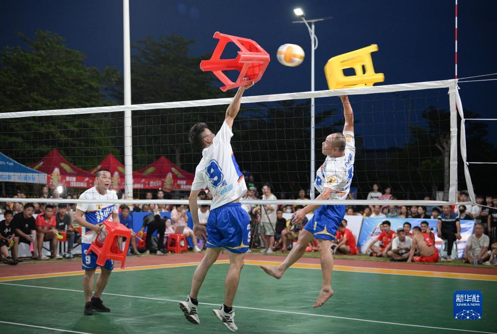 “村排”龙楼站赛间,球员们用凳子打排球,为观众表演具有文昌特色的“凳子排球”(7月1日摄)。新华社记者 蒲晓旭 摄