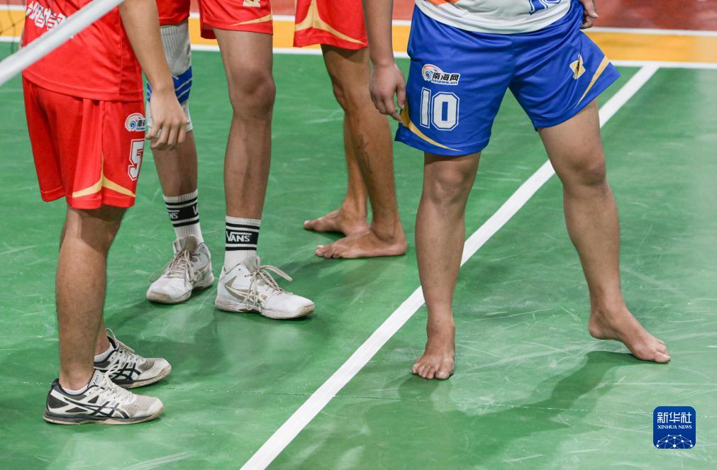 一场“村排”比赛中,部分队员赤脚上场参赛(7月1日摄)。在文昌,很多人从小就习惯赤脚打排球。新华社记者 蒲晓旭 摄
