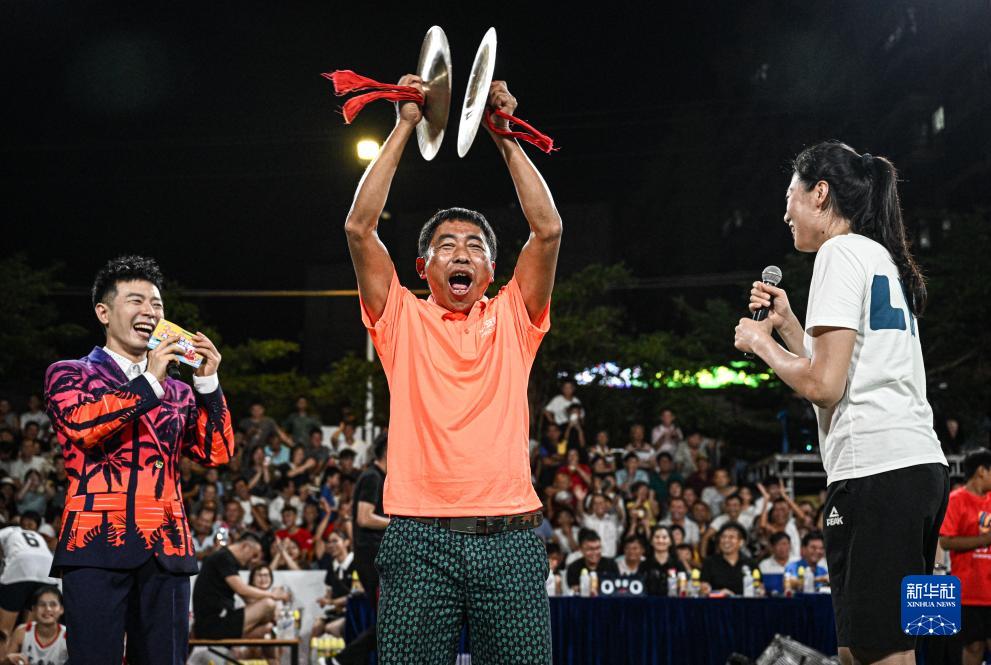 “村排”铺前站比赛期间,龙楼镇队教练黄梓(中)与前中国女排球员刘晏含互动交流(7月21日摄)。新华社记者 蒲晓旭 摄
