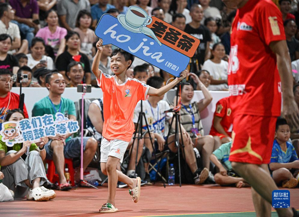 在“村排”决赛现场,一名拉拉队员在庆祝球队得分时高举“老爸茶”字样的标牌(8月13日摄)。老爸茶是海南地方饮食文化的一大特色。新华社记者 蒲晓旭 摄
