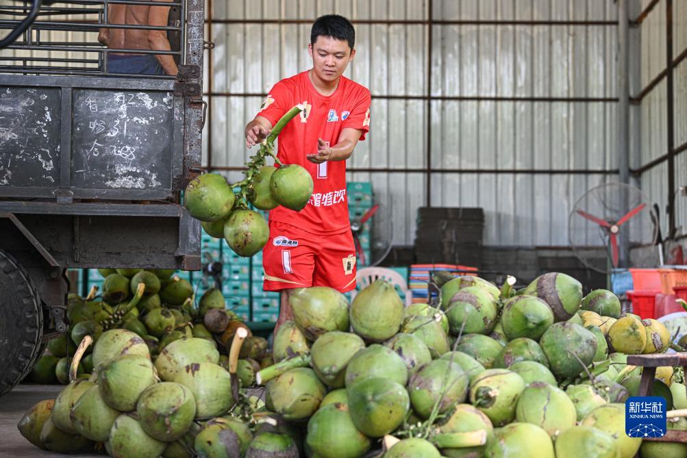文教镇队队员利光亮在文昌市东郊镇的一家椰子加工厂分拣椰子(7月30日摄)。利光亮今年30岁,以经销椰子及加工产品为主业。新华社记者 蒲晓旭 摄