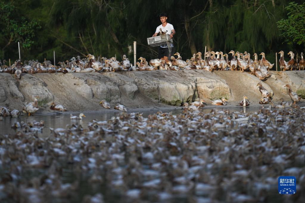 昌洒镇队队员邢维毛在打理他的养鸭场(7月29日摄)。邢维毛今年21岁,是文昌市昌洒镇人,在当地以经营养鸭场为业。新华社记者 蒲晓旭 摄