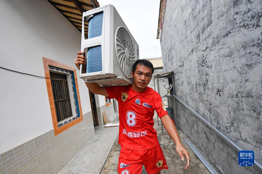 “村排”昌洒队队员陈锦武在海南省文昌市翁田镇为客户安装空调(7月31日摄)。陈锦武今年35岁,是文昌市昌洒镇人,在文昌经营家电销售和安装、维修生意。新华社记者 蒲晓旭 摄