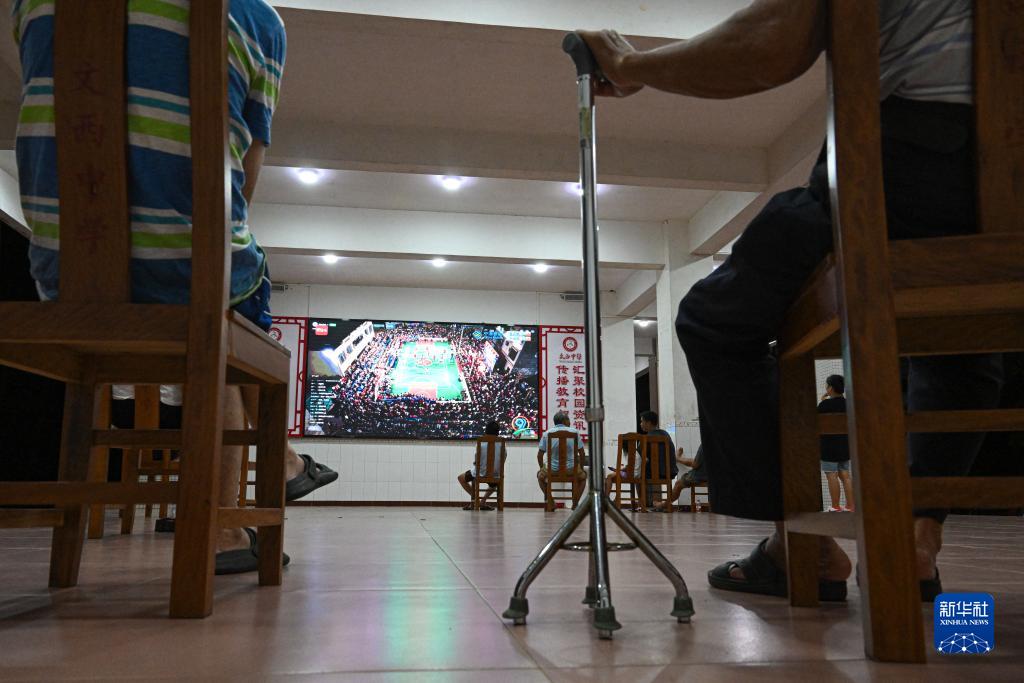 在海南省文昌市文西中学,几位老人在深夜观看“村排”比赛直播(7月28日摄)。新华社记者 蒲晓旭 摄