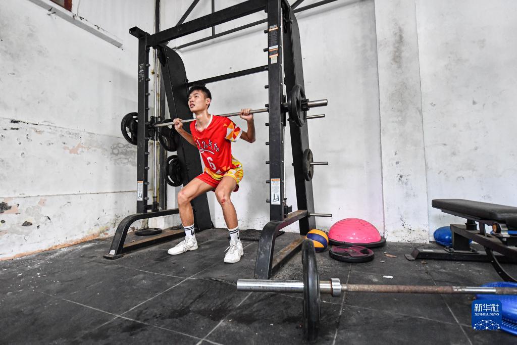 重兴镇队队员符兴泓在文昌中学进行体能训练(7月30日摄)。 符兴泓是海南省文昌市重兴镇人,今年16岁,身高195公分的他是文昌中学排球队队员,即将就读高二。新华社记者 蒲晓旭 摄