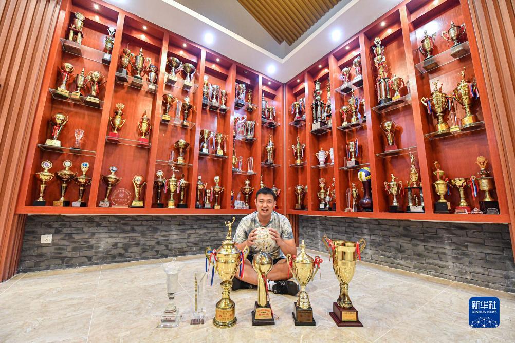 公坡镇队队员、文昌中学排球队助理教练周国宝在文昌中学校史馆展示他曾于2009年至2012年就读文昌中学期间,代表该校出战全国中学生排球比赛获得的多个奖杯。在他身后,是文昌中学排球队历年获得的部分奖杯(7月31日摄)。新华社记者 蒲晓旭 摄
