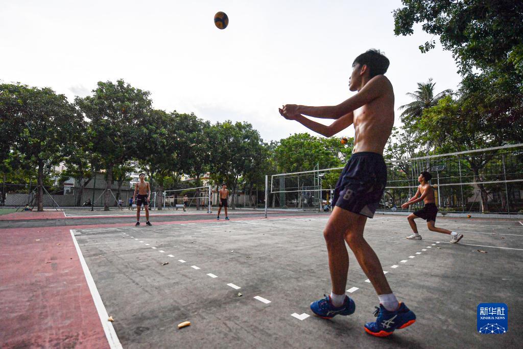 文昌中学排球队队员正在文昌中学校内训练(7月30日摄)。文昌中学排球队是文昌排球文化的重要组成部分,培养了大批排球人才。新华社记者 蒲晓旭 摄