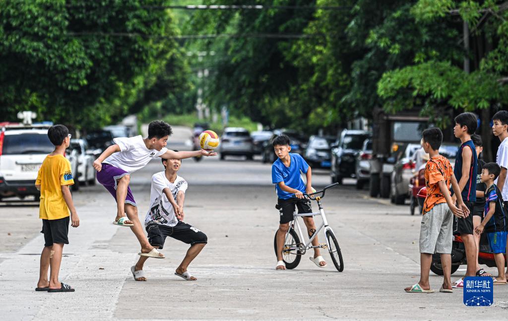 一群孩子在海南省文昌市东阁镇附近玩排球(7月19日摄)。新华社记者 蒲晓旭 摄