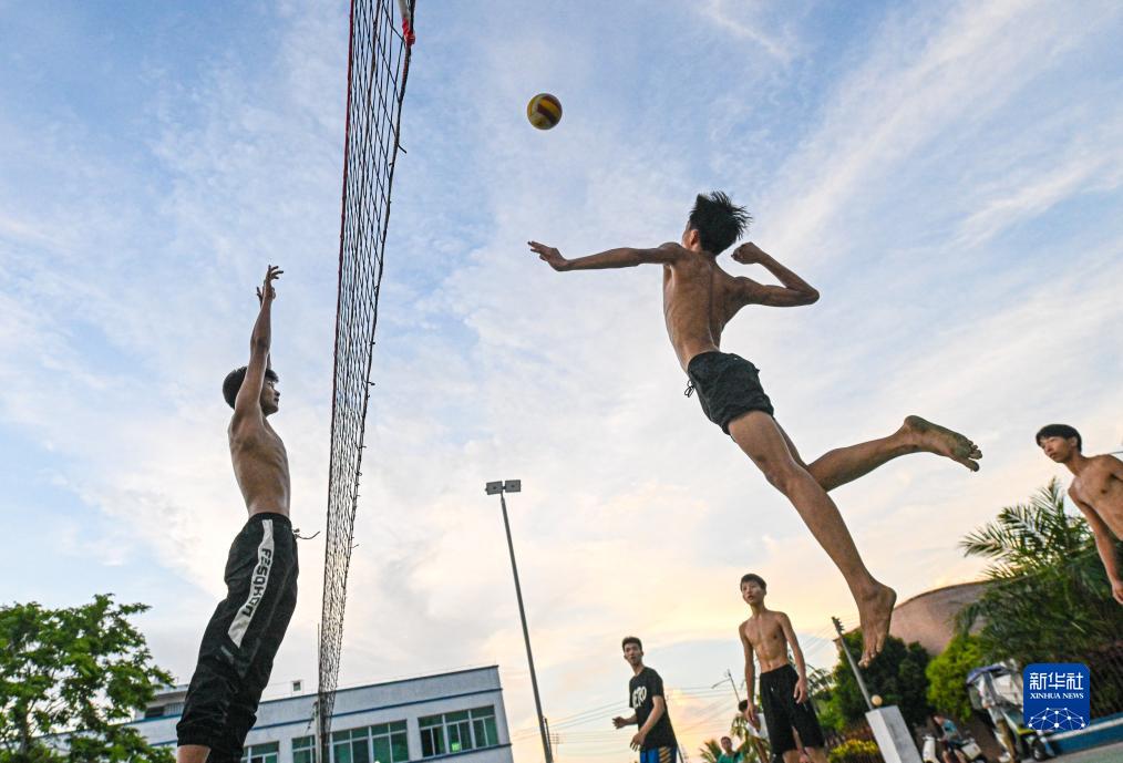 傍晚,一群青年在海南省文昌市东阁镇打排球(7月19日摄)。新华社记者 蒲晓旭 摄