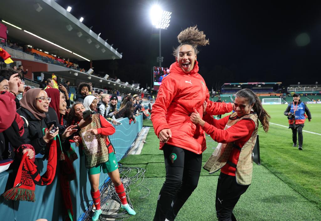8月3日,摩洛哥队球员与球迷在赛后庆祝胜利。当日,在澳大利亚珀斯举行的2023年国际足联女足世界杯小组赛H组比赛中,摩洛哥队以1:0战胜哥伦比亚队,两队携手晋级淘汰赛。新华社记者 丁汀 摄