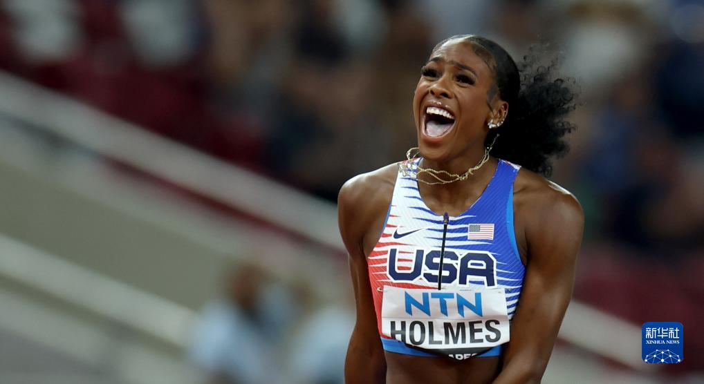 8月19日,美国队第四棒选手霍尔莫斯在比赛中准备接棒。最终美国队以3分08秒80的成绩夺得冠军并创造了该项目新的世界纪录。新华社记者 王丽莉 摄