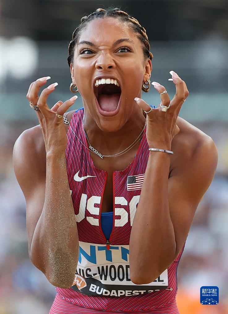 8月20日,美国选手戴维斯-伍德霍尔在最后一次试跳后庆祝。新华社记者 李明 摄