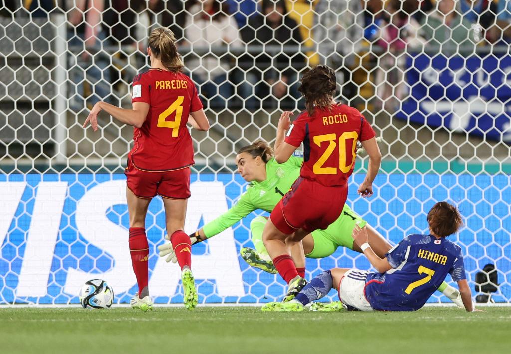 7月31日,西班牙队守门员米莎·罗德里格斯(左二)未能扑出日本队球员宫泽日向(右一)的射门。当日,在女足世界杯C组比赛中,日本队以4:0战胜西班牙队。新华社记者 秦朗 摄