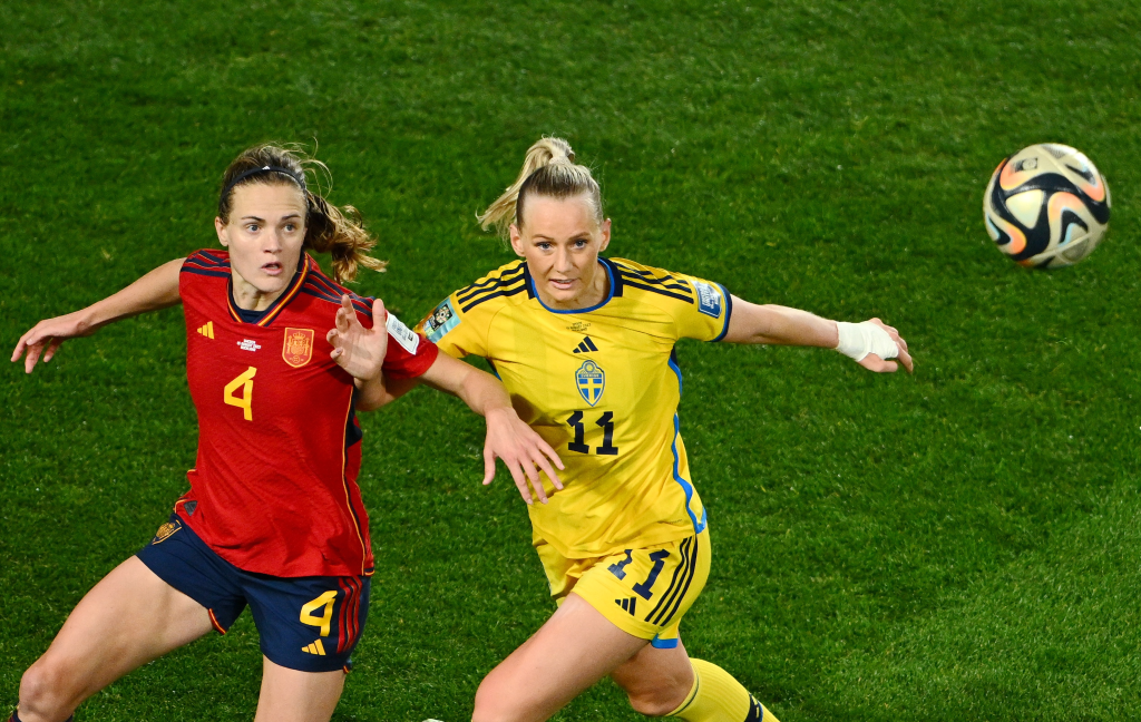 8月15日,西班牙队球员帕雷德斯(左)和瑞典队球员布莱克斯特纽斯在比赛中拼抢。新华社记者李一博摄