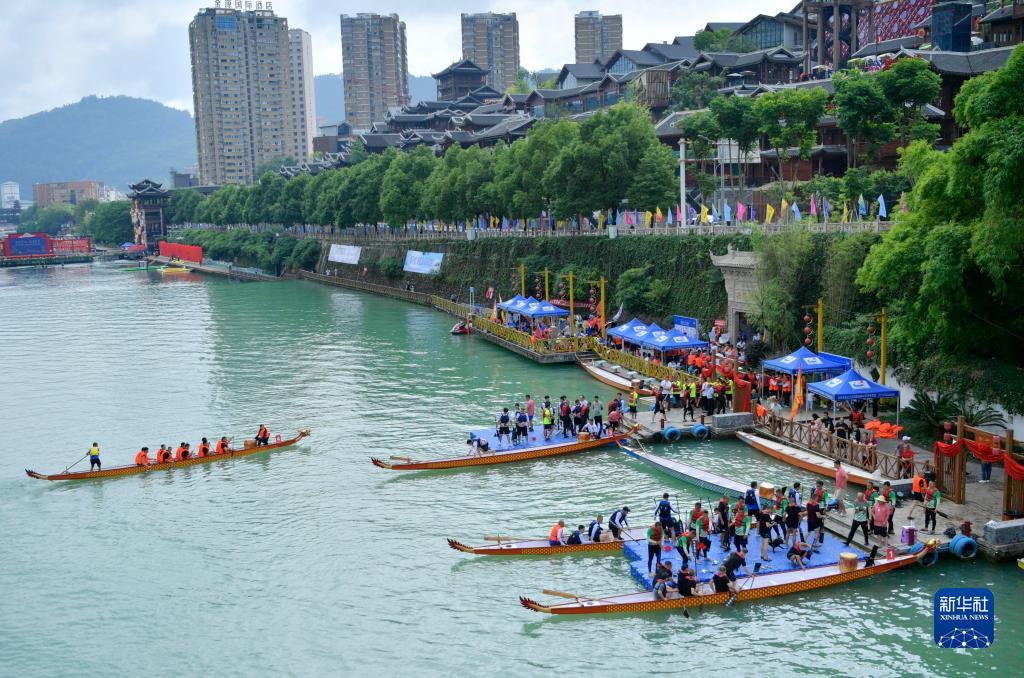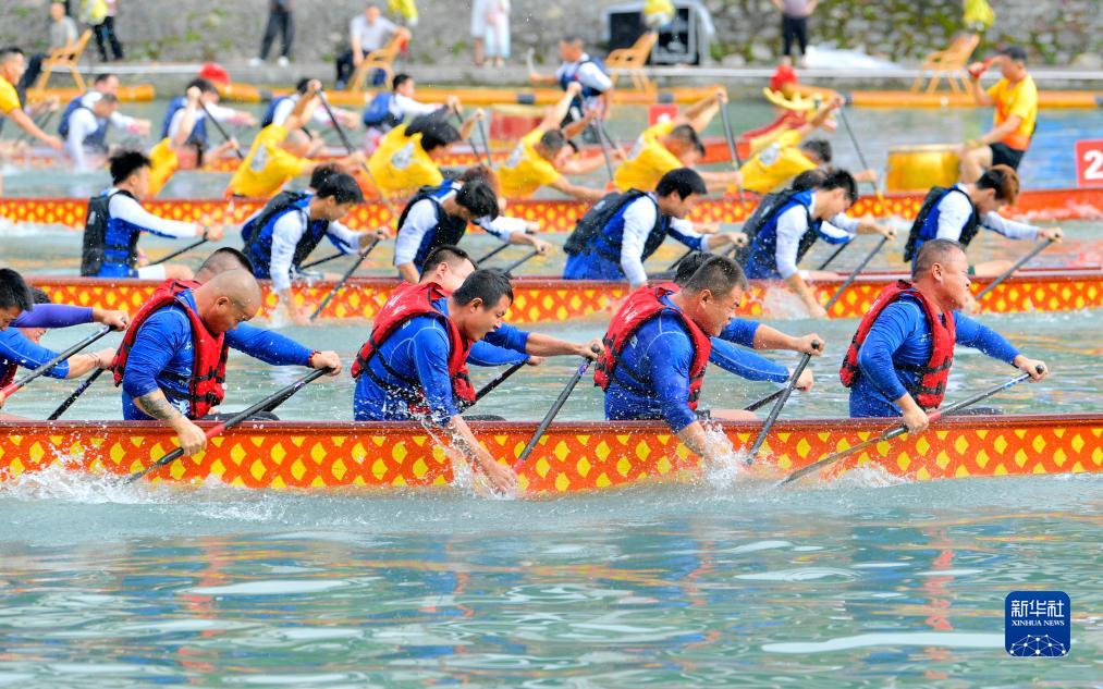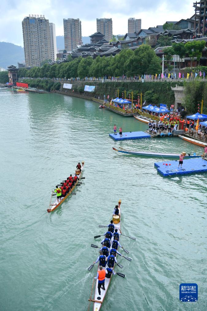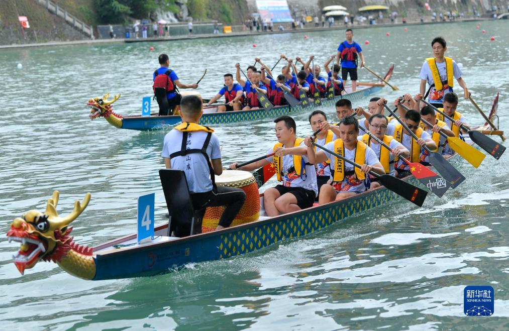 8月22日,选手在湖北省宣恩县城贡水河上进行龙舟比赛。新华社发(宋文摄)