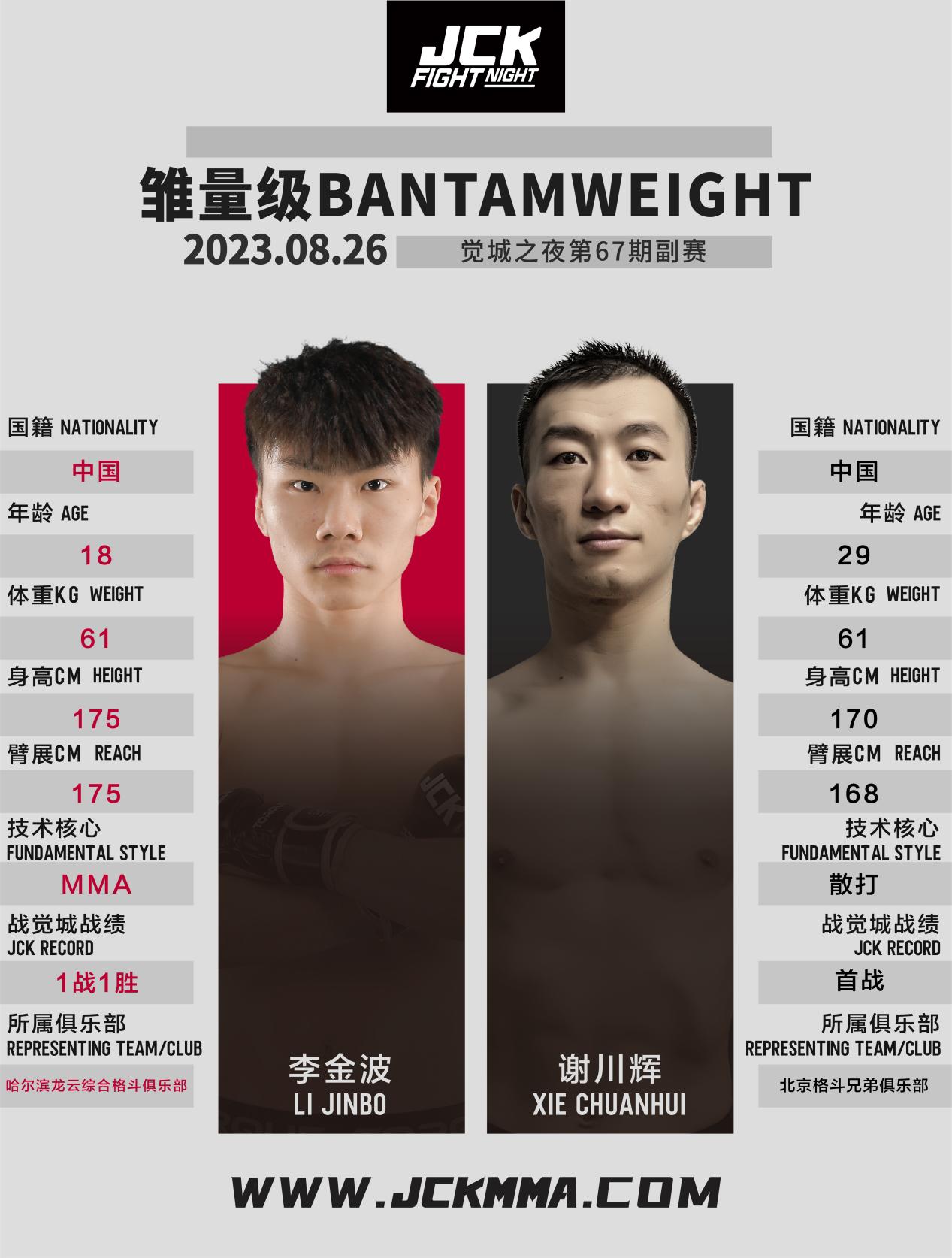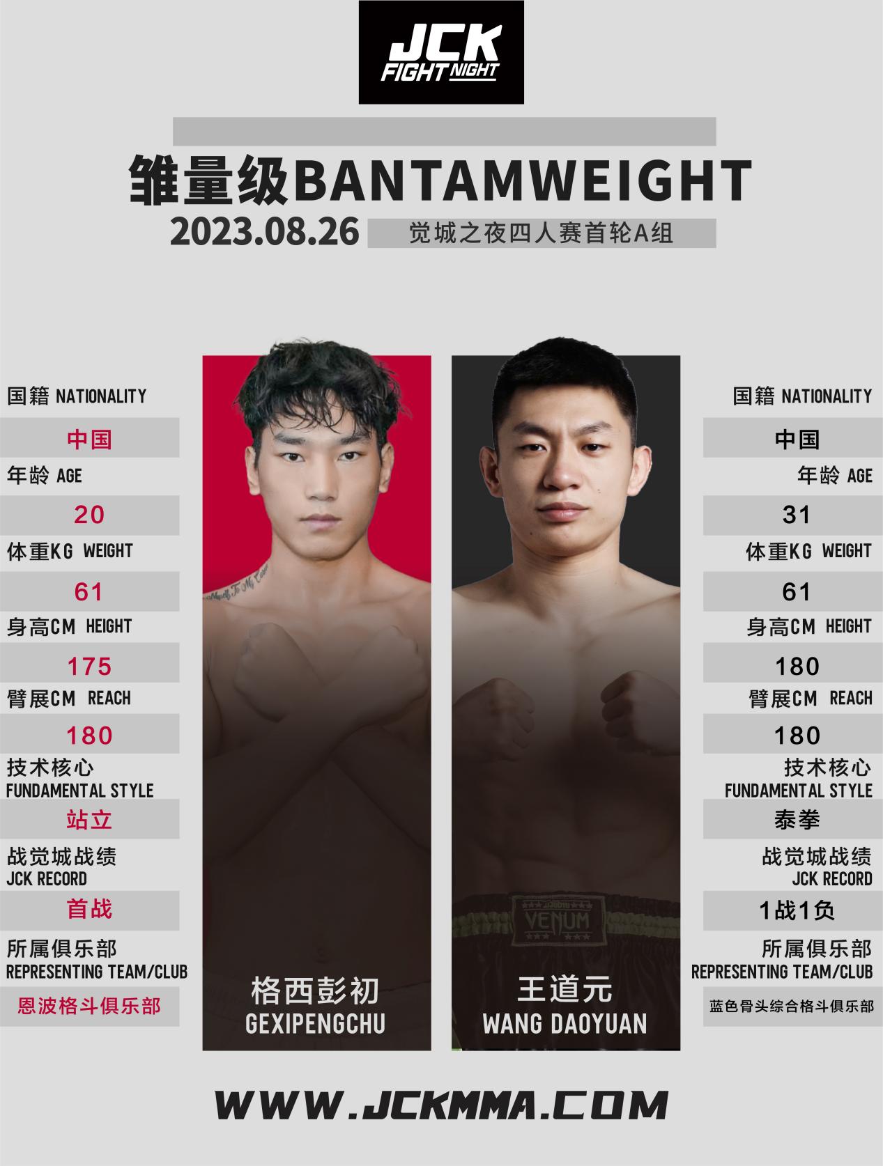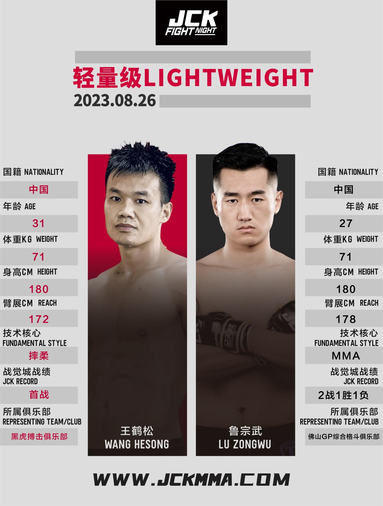 王鹤松,31岁,职业战绩3战3胜,与2022-2023赛季雏量级金腰带获得者王绍祥同俱乐部,本场首战JCK战觉城。 鲁宗武,年龄27岁,职业战绩5战4胜,职业生涯胜场率80%,JCK战觉城2022-2023赛季,曾首回合TKO廖礼聪。