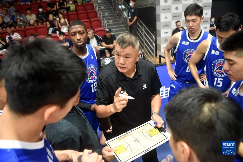 8月23日,香港金牛队主教练刘铁(中)在比赛间隙为球员布置战术。新华社记者 卢炳辉 摄