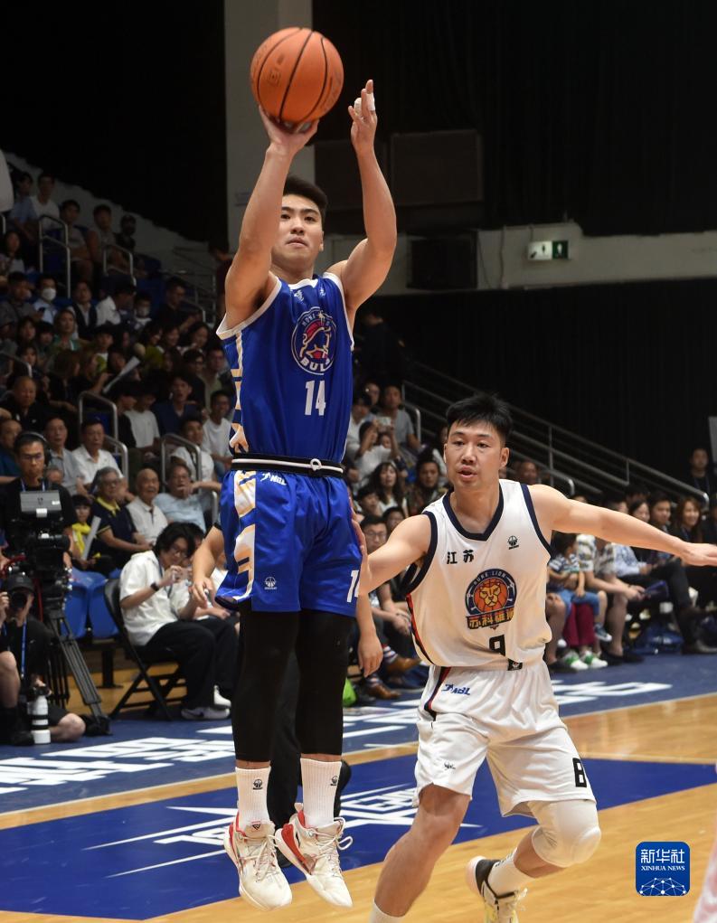 8月23日,香港金牛队球员毕继光(左)在比赛投篮。新华社记者 卢炳辉 摄