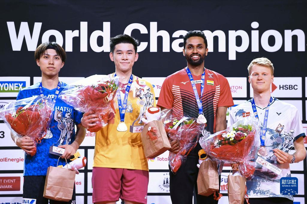 8月27日,冠军泰国选手昆拉武特(左二)、亚军日本选手奈良冈功大(左一)、并列季军印度选手普兰诺伊(右二)和丹麦选手安东森在颁奖仪式上合影。新华社记者 任鹏飞 摄