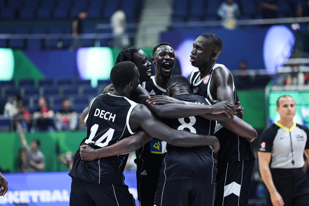 8月28日,南苏丹队球员在比赛后庆祝。新华社记者 吴壮 摄