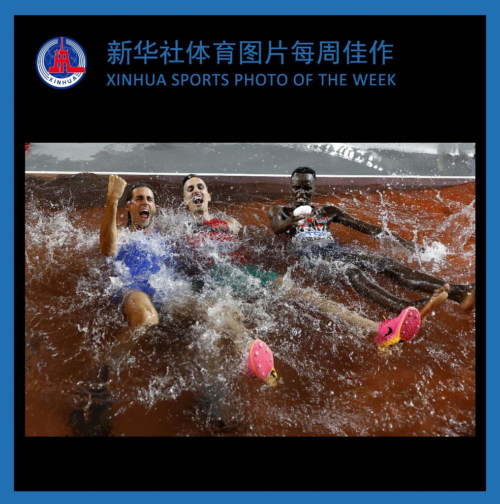8月22日,男子跳高冠军意大利选手坦贝里(左)、男子3000米障碍赛冠军摩洛哥选手艾尔巴卡里(中)与季军肯尼亚选手基比沃特跳入3000米障碍赛的水坑里庆祝。新华社记者 王丽莉 摄