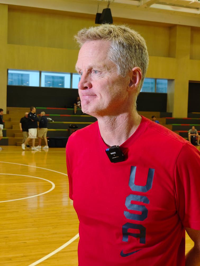 坐在场边的美国队主教练史蒂夫·科尔看起来心情不错,和助理教练们聊着天,把训练交给了两个中国球迷熟悉的面孔——杰夫·范甘迪和格兰特·希尔,前者是这支美国队的信息收集负责人,后者则是领队。