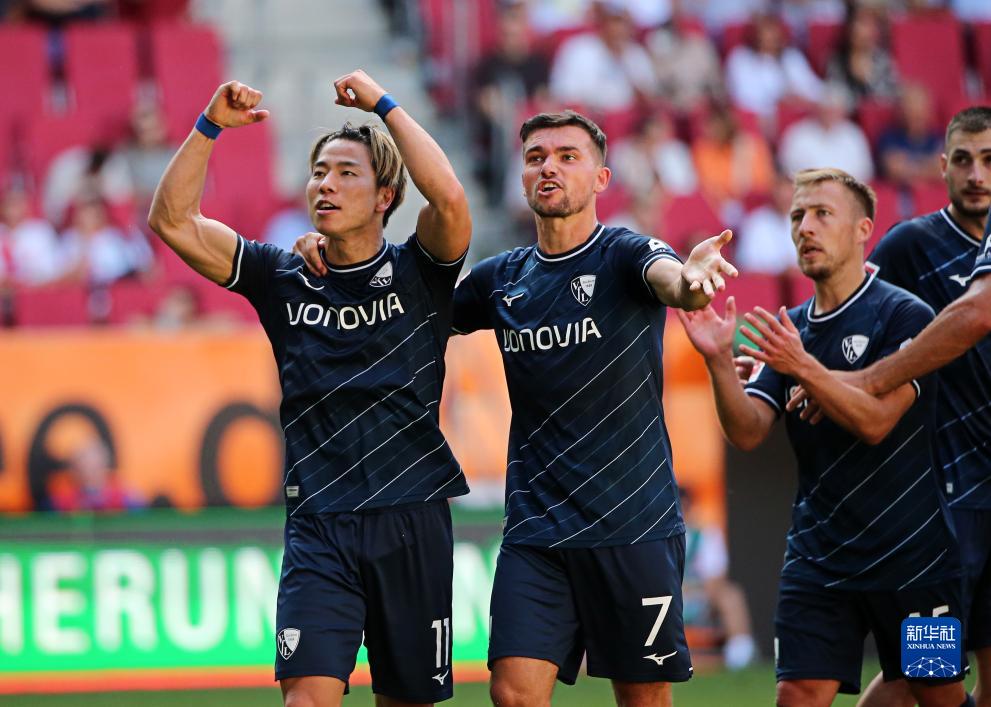 9月2日,波鸿队球员浅野拓磨(左一)打入本场比赛个人第二粒进球后与队友庆祝。