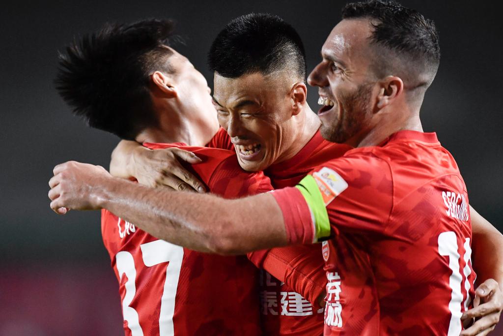 8月20日,长春亚泰队球员谭龙(中)在比赛中与队友庆祝进球。当日,在吉林长春举行的2023赛季中国足球协会超级联赛第23轮比赛中,长春亚泰队主场以3:1战胜沧州雄狮队。新华社记者许畅摄