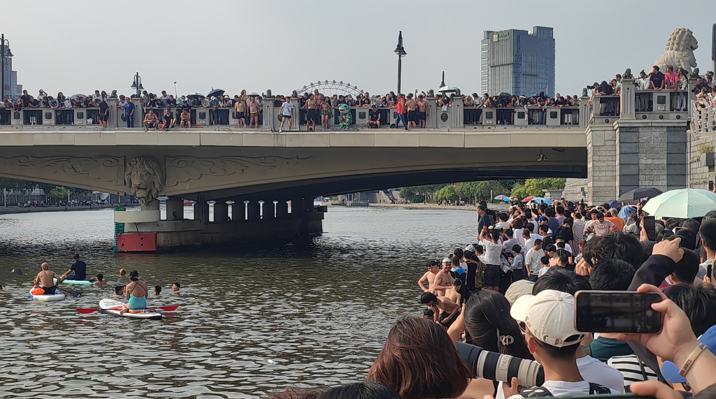 9月2日,天津海河狮子林桥上,一些人“跃跃欲试”。新华社记者 孙凡越 摄
