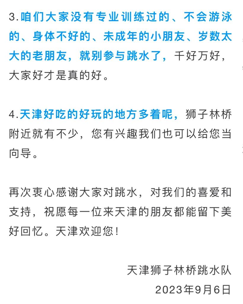 “跳水大爷”们当天以天津狮子林桥跳水队的名义发了一份倡议书。倡议书说,狮子林桥跳水队最早是由天津本地游泳爱好者组成,他们年轻时就在海河里游泳,后来水性特别好的开始尝试跳水。跳水队平均年龄60多岁,已跳水30多年,跳水让大家强身健体、乐在其中。但目前跳水的人太多,有些朋友没有经过准备和训练,出现了危险和隐患,给救援工作增加了难度。大家不想看到有人受伤。