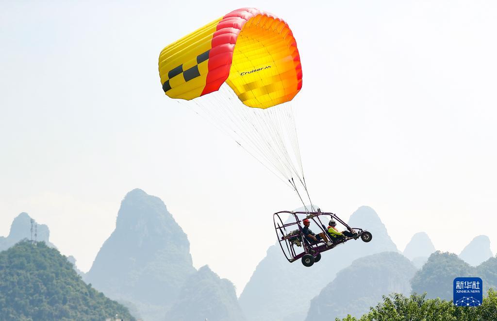 9月5日,游客在广西桂林市阳朔县体验动力滑翔伞。新华社记者 胡星宇 摄