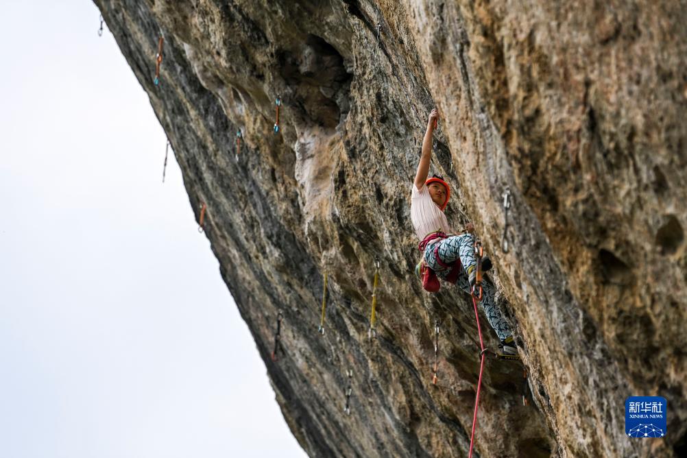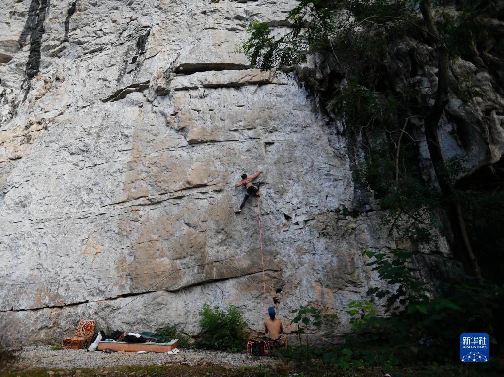 9月5日,攀岩爱好者在广西桂林市阳朔县攀岩。新华社记者 胡星宇 摄